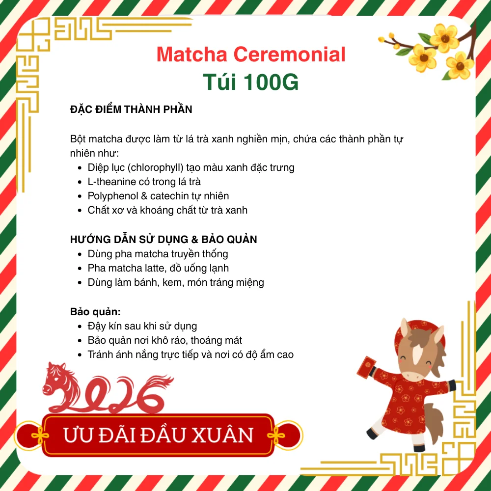 Sản phẩm thuộc phân khúc matcha ceremonial grade, phù hợp để thưởng trà nguyên bản, pha matcha latte hoặc sử dụng trong chế độ sống lành mạnh.